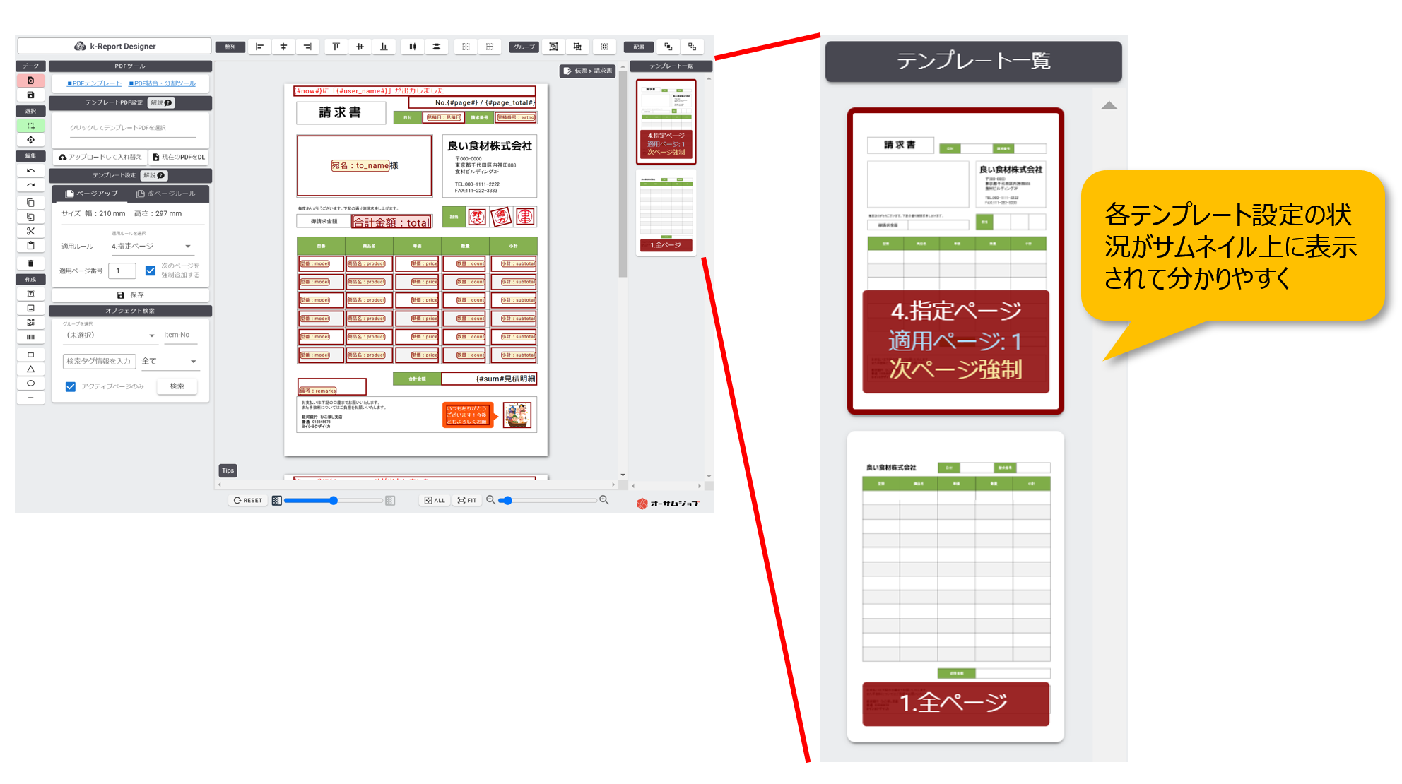 帳票デザイナーのテンプレート一覧の上にそれぞれのテンプレートの自動ページアップ設定の内容が表示されるようになりました。網羅的に全体のテンプレート設定状態をご確認頂けるようになりました!