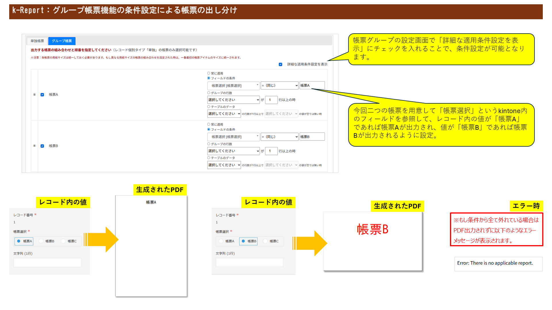 - kintoneのレコードの値によってグループ帳票の出力構成を変更する事はできますか?