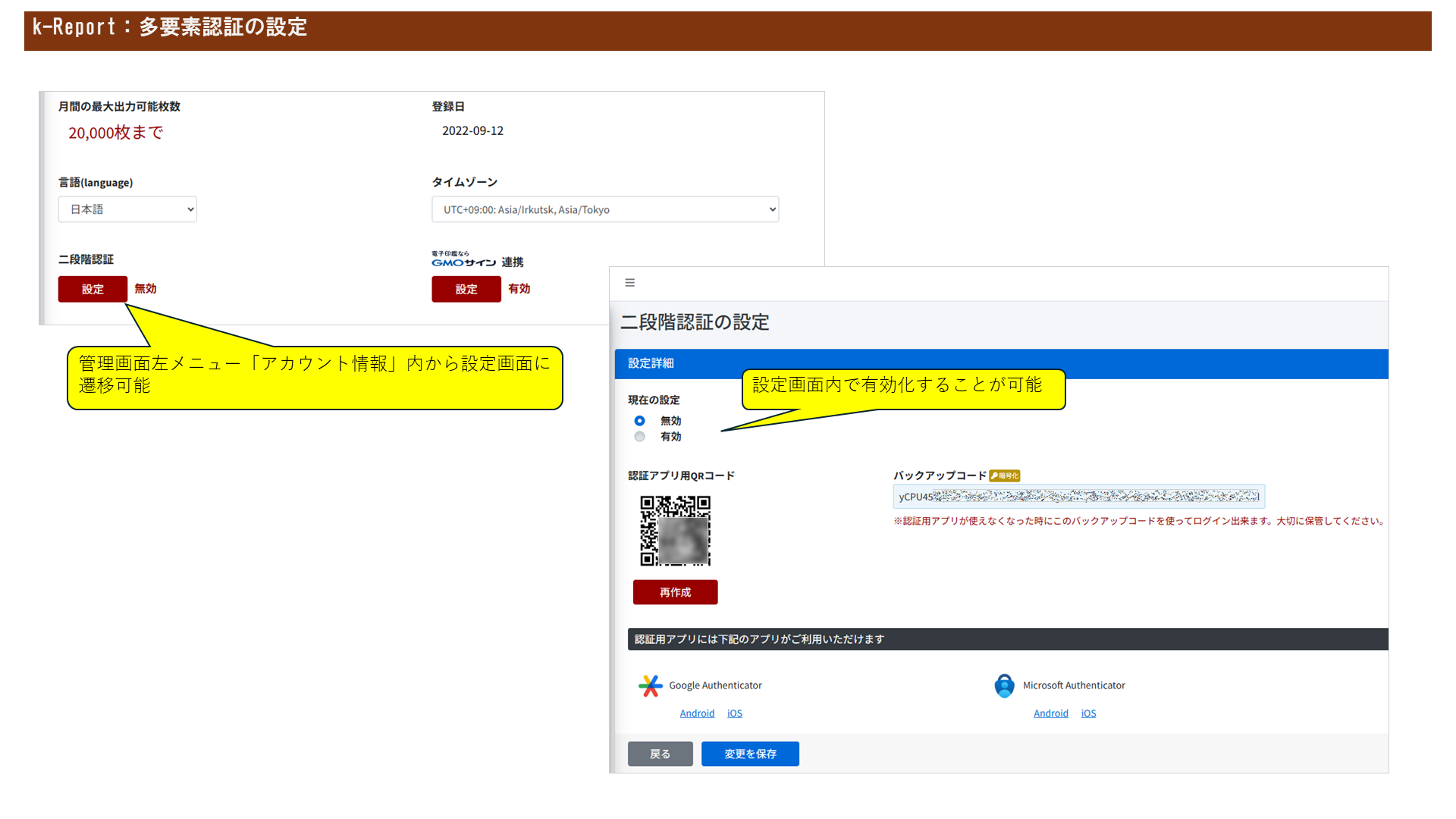 デフォルトでは無効化されておりますが、管理画面左メニュー「アカウント情報」から「二段階認証」という項目がございますので、そちらから設定頂けます。