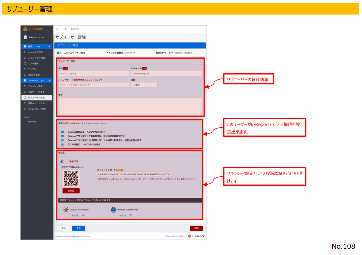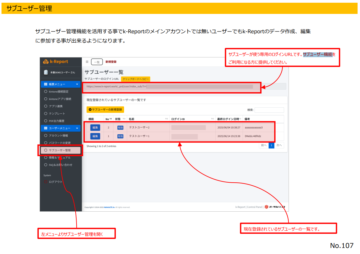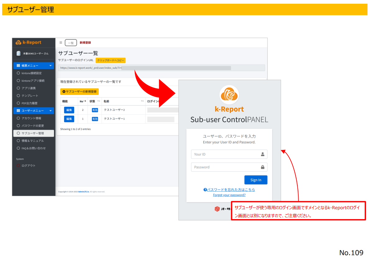 k-Reportではメインアカウントに紐づいたサブユーザーの作成が可能となっております。 サブユーザーは一部機能の利用やアクセスは制限されますが、メインアカウントのログインID(メールアドレス)とは別のログインIDを設定可能となっております。 サブユーザーは追加費用無しで全てのユーザー様が利用可能な機能となります。
