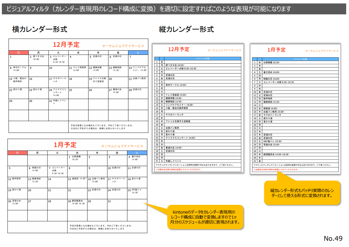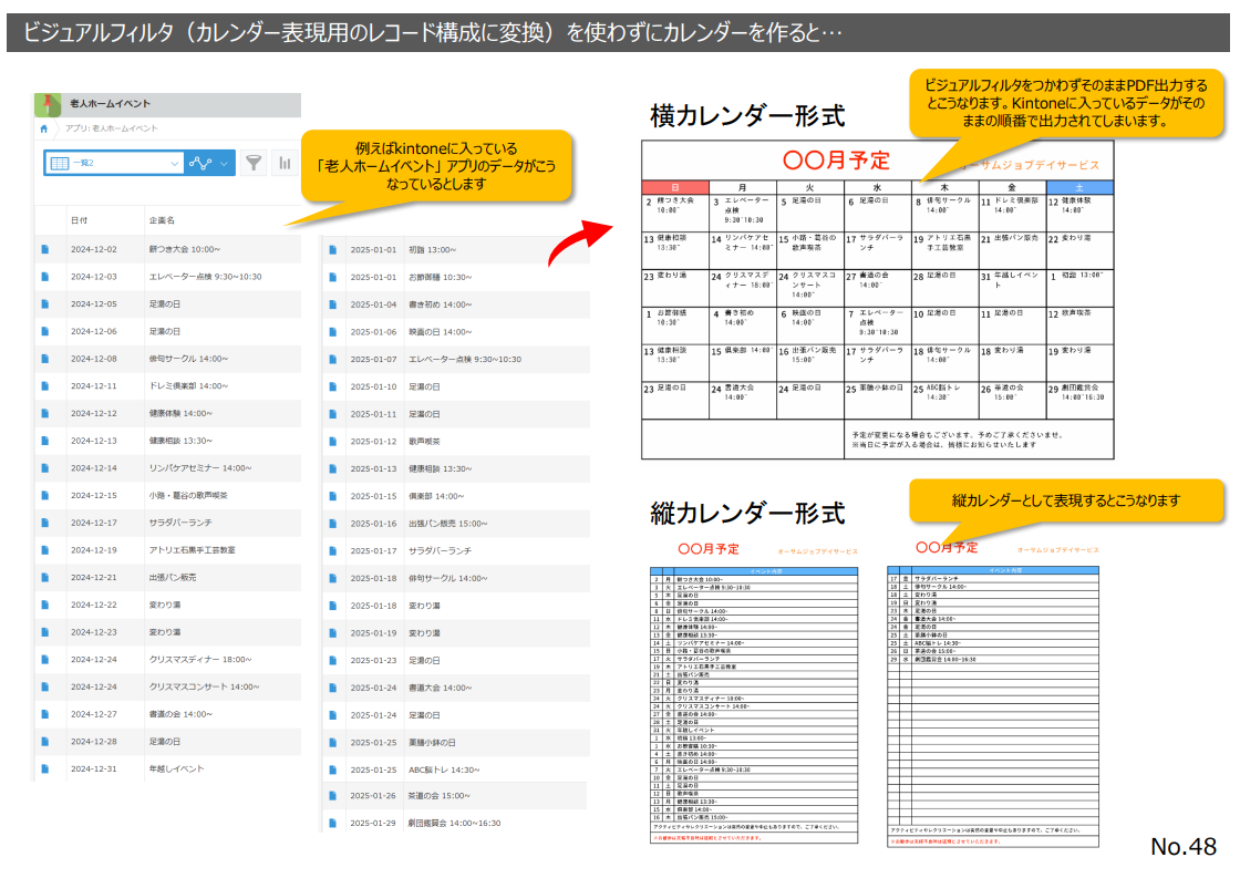 ビジュアルフィルタ内のコマンドブロック「カレンダー表現用のレコード構成に変換」を使用することで、kintone上に存在しない日付や空行を行として生成します。