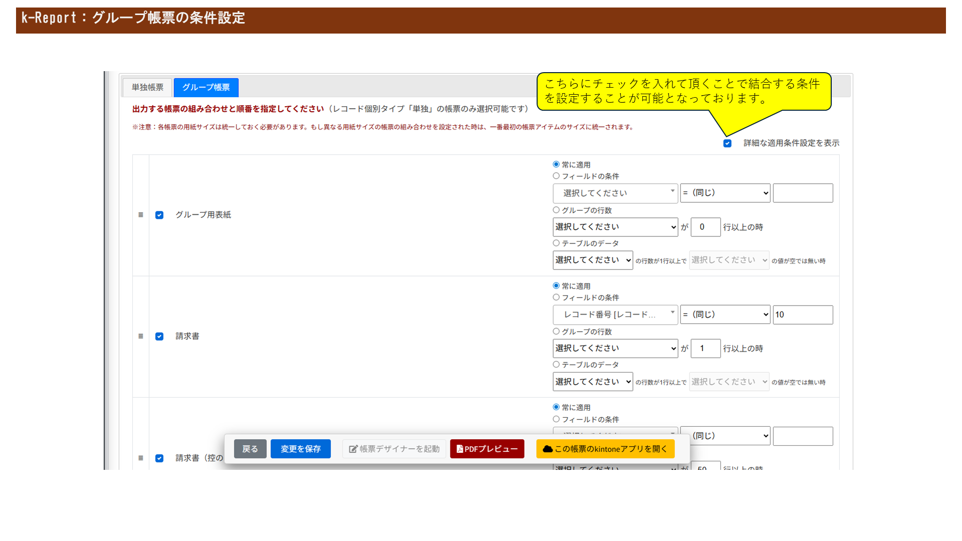 グループ帳票の設定画面内で「詳細な適用条件設定を表示」にチェックを入れることで設定可能となります。