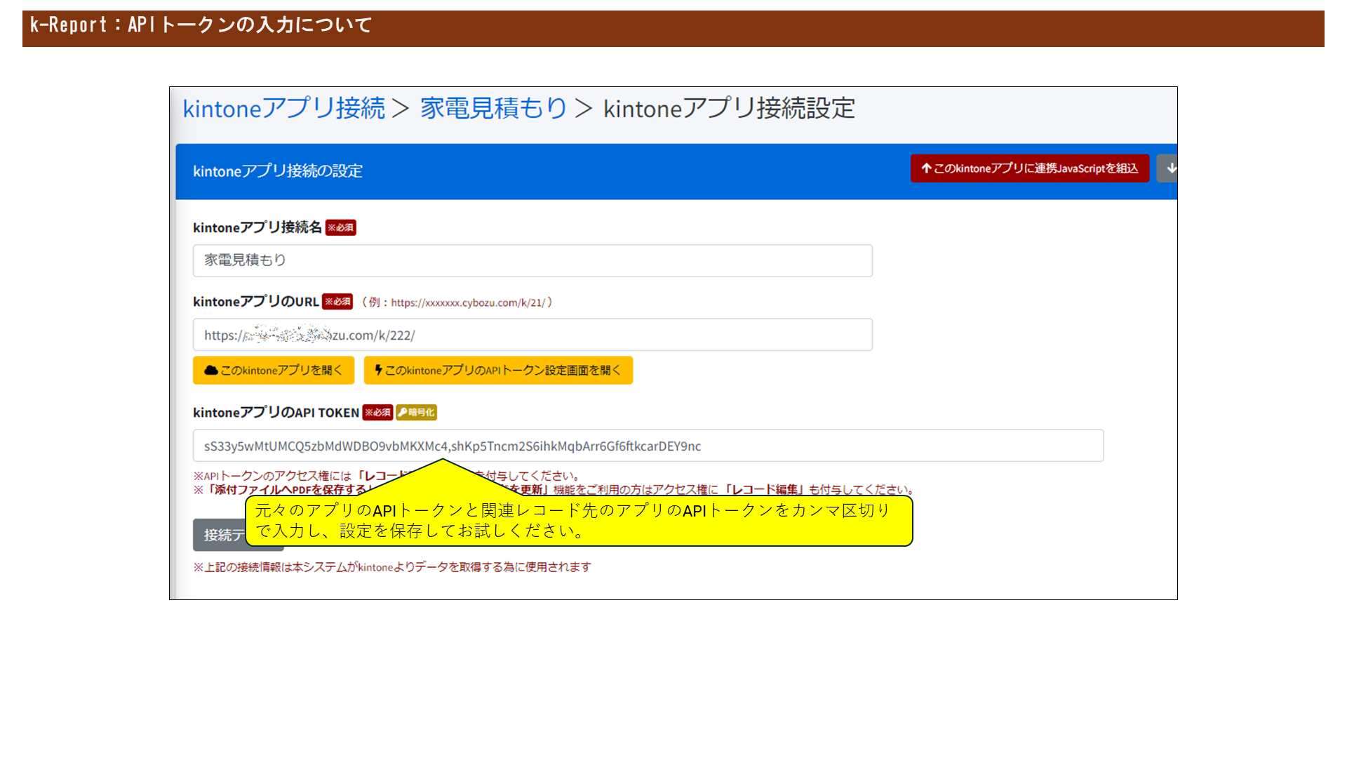 k-Reportのアプリ接続設定画面内でkintoneアプリのAPI Tokenを設定するときに関連レコード先のアプリのTokenをカンマ区切りで入力していただくと、関連レコード内のデータを描画することができます。